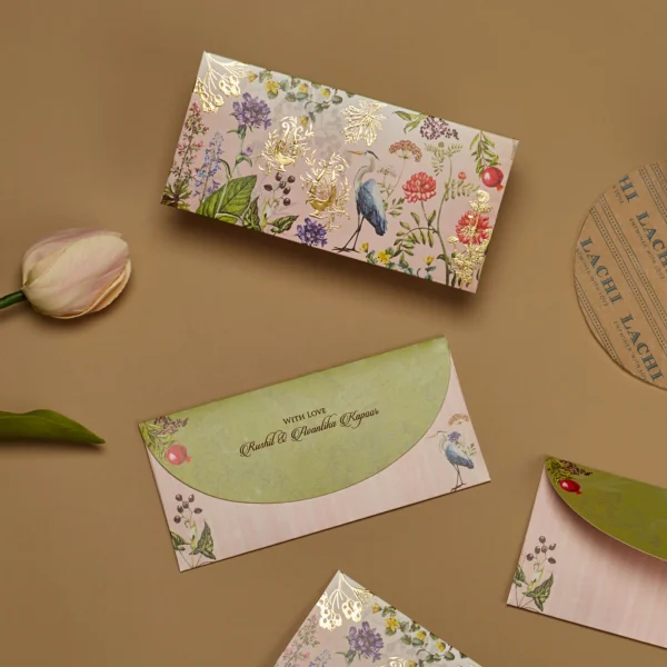 - Premium Gift Envelopes with Gold Foiling and Royal Designs on them.